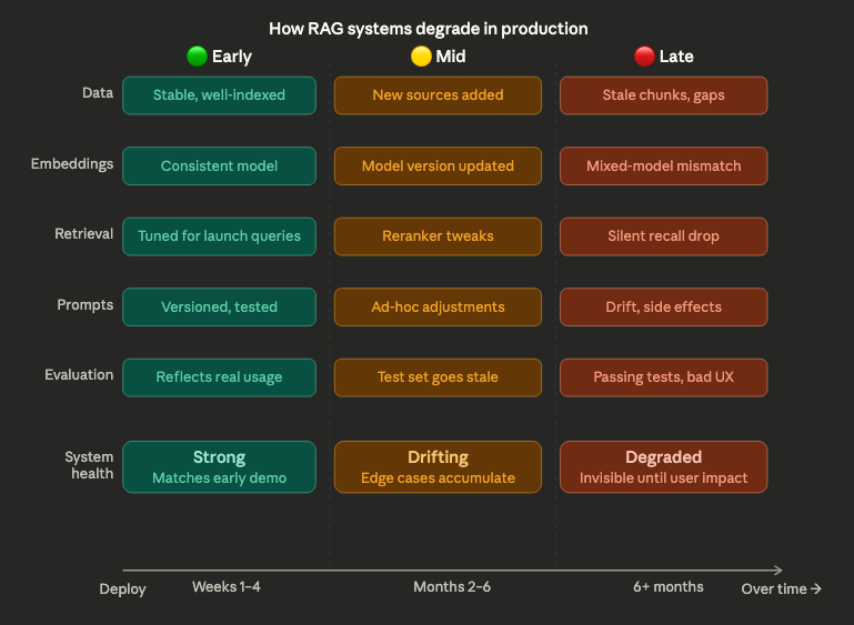 RAG systems often start strong. Early demos look promising, responses feel relevant, and initial evaluations show solid performance. But over time, something changes. Answers become less consistent, retrieval quality drifts, and edge cases appear more frequently. The system hasn’t been “broken” — but it’s no longer behaving the way it did at the start. This gradual decline is one of the most common and least discussed challenges in production AI systems.