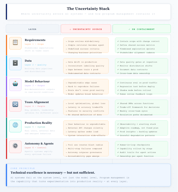 Most AI systems don’t fail because of poor models. They fail because the surrounding system — people, processes, and decisions — isn’t designed to handle uncertainty. Teams often focus heavily on model quality, infrastructure, and performance benchmarks, assuming that technical excellence will naturally translate into successful outcomes. In reality, production AI systems introduce ambiguity at every layer: shifting requirements, evolving data, and unpredictable behavior. Without strong program management, even technically sound systems struggle to deliver consistent value.