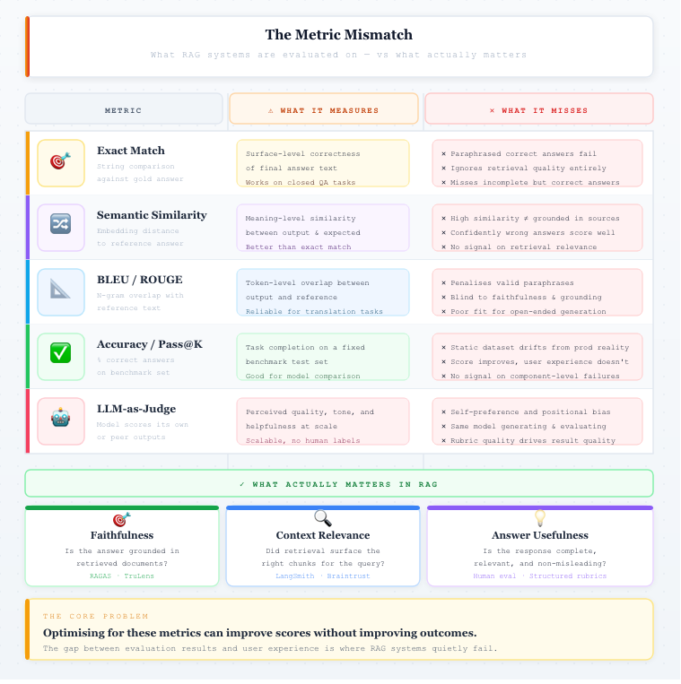 There is also a mismatch between what is measured and what actually matters. Metrics such as exact match or semantic similarity capture correctness at a surface level, but fail to reflect usefulness, relevance, or grounding in retrieved data. A response may be technically correct yet incomplete, misleading, or disconnected from its sources. Optimizing for these metrics can improve scores without improving outcomes, creating a gap between evaluation results and user experience.